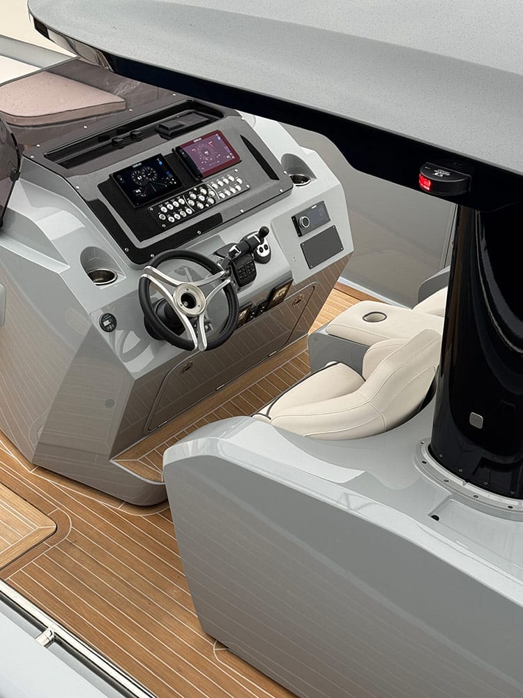 Every detail has been designed for purpose and polish. Superyacht-grade paint finish ensures a flawless mirror-like surface, while the self-draining composite deck features ESTHEC® teak-style flooring in custom colours and engravings.